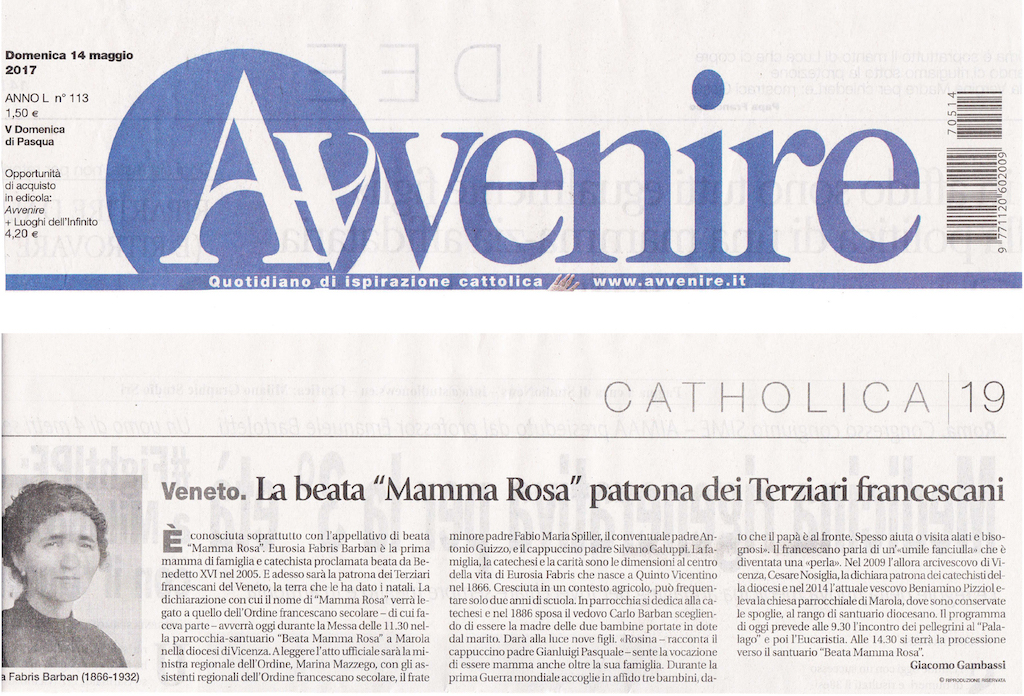 ”Non posso non sottolineare l’importanza della testimonianza data dalle famiglie cristiane, diceva papa Francesco, in Corea, il 16 agosto 2014. In un’epoca di crisi della vita familiare, le nostre comunità cristiane sono chiamate a sostenere le coppie sposate e le famiglie nel compimento della loro missione nella Chiesa e nella società.» Eurosia Fabris Barban, madre di famiglia, è stata beatificata il 6 novembre 2005 da Benedetto XVI. Il venerabile Pio XII già diceva di lei: «Bisogna far conoscere questa bella anima, è un esempio per le famiglie di oggi!» Eurosia Fabris Barban è nata nel 1866 da una famiglia di agricoltori italiani. Luigi e Maria Fabris, i suoi genitori, vivono nel comune di Quinto Vicentino, nel Veneto. La bambina viene battezzata poco dopo la nascita e riceve il nome di una vergine martire del IX secolo, santa Eurosia, principessa di Boemia fatta prigioniera dai Saraceni e morta per la sua fede. Appassionata del Vangelo Nel 1870, la famiglia si trasferisce a Marola, nel comune di Torri di Quartesolo. Eurosia vi abiterà per tutta la vita. Occupata nei lavori agricoli e domestici, frequenta la scuola elementare solo tra il 1872 e il 1874. Questi due anni di istruzione le consentono di imparare a leggere e a scrivere. Si familiarizza con la Sacra Scrittura, il catechismo, la Storia sacra?; legge l’Introduzione alla vita devota di san Francesco di Sales e le Massime eterne di sant’ Alfonso de’ Liguori. Sua madre le insegna il suo futuro mestiere di sarta. A partire dalla sua prima Comunione, a dodici anni, si comunica in ogni giorno di festa. Iscritta all’associazione delle Figlie di Maria nella sua parrocchia, s’impegna nell’osservanza del suo statuto. La sua pietà mariana cresce sotto l’influsso del vicino santuario della Madonna del Monte Berico, dove la Vergine era apparsa nel XV secolo, liberando la regione da un’epidemia di peste. Eurosia vi prega Maria perché la malattia spiritualmente mortale dell’indifferentismo e dell’empietà si allontani dal suo paese. La sua devozione si rivolge anche verso lo Spirito Santo, il Presepio, il Crocifisso e le anime del Purgatorio. Si appassiona al Vangelo e al catechismo, che insegna, fin dall’età di quindici anni, ai bambini della parrocchia; in seguito farà lo stesso nei confronti delle ragazze che frequenteranno il suo laboratorio di cucito. Ha un modo tutto personale di rendere questo insegnamento appassionante per il suo giovane uditorio, disseminando l’esposizione dottrinale di aneddoti e istruzioni morali e pratiche. Ma i bambini percepiscono prima di tutto la grande carità che la anima: si sentono amati e comprendono che cosa significhi amare Dio. Eurosia trova la sorgente di questo grande amore nella preghiera. Fin dalla sua più tenera infanzia, prega e medita regolarmente. A diciotto anni, è una ragazza seria, pia e laboriosa. Nonostante la povertà della famiglia, cura la pulizia e l’ordine. Le sue virtù e il suo fascino non passano inosservati: riceve diverse proposte di matrimonio, che rifiuta. Nel 1885, una giovane vicina, la signora Barban, muore lasciando tre figlie in tenera età, di cui la prima muore anche lei poco dopo. Le altre due hanno rispettivamente venti e quattro mesi. Uno zio e il nonno, malato cronico, vivono con il padre delle due orfane. Sono uomini dal temperamento forte, che spesso litigano tra di loro. Per sei mesi, ogni mattina, Eurosia va a prendersi cura di queste bambine e sbriga le faccende domestiche. Carlo Barban, il vedovo, non tarda a chiederla in moglie. Dopo aver a lungo pregato per conoscere la volontà del Signore, e ben consapevole delle difficoltà future, ella segue il consiglio sia dei suoi genitori che del suo parroco, e accetta di sposare Carlo. Il matrimonio, che considera come una missione di Dio, viene celebrato il 5 maggio 1886?; sarà benedetto dalla nascita di nove figli, senza contare le due piccole orfane e tre adozioni. Uniti dal sacramento del matrimonio, i coniugi Barban camminano insieme verso la santità prendendosi cura dei loro numerosi figli. Dove trovare i mezzi economici per allevarli. Certo, Carlo possiede delle terre fertili, ma ha ereditato debiti pesanti. Eurosia lo incoraggia alla fiducia: «I figli, Dio ce li invia come un tesoro. Confidiamo in Lui, perché Egli non permetterà che ci manchi il necessario.»
